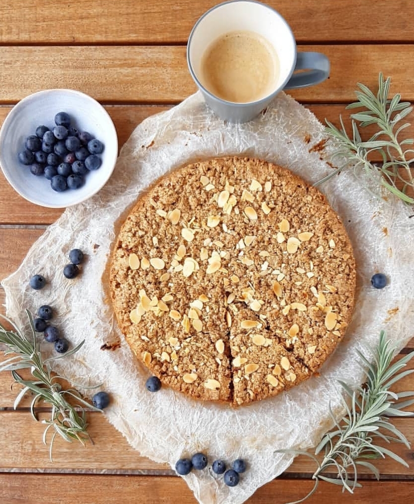 Prepariamola insieme , procuriamoci 200 g di burro ,250 g di farina di grano saraceno , 250 g farina di riso , 170 g di zucchero di canna , un cucchiaino di cannella , 1 bustina di lievito per dolci , 2 uova intere e confettura di mirtilli per la farcia. Iniziamo mettendo tutti gli ingredienti per la frolla in un mix e frulliamo finché il composto si presenterà in grosse briciole. Rivestiamo uno stampo con la carta forno e lo ricopriamo con la metà delle briciole, compattiamolo bene con il dorso delle mani in modo uniforme, formando così una base. Risaliamo anche sui bordi della tortiera. Farciamo con la confettura di mirtilli e ricopriamo tutto con le restanti briciole di farina. Cospargiamo poi con altro zucchero di canna la superficie e se è di vostro gradimento , aggiungiamo qualche lamella di mandorla. Inforniamo a 180 ° per 40 minuti.