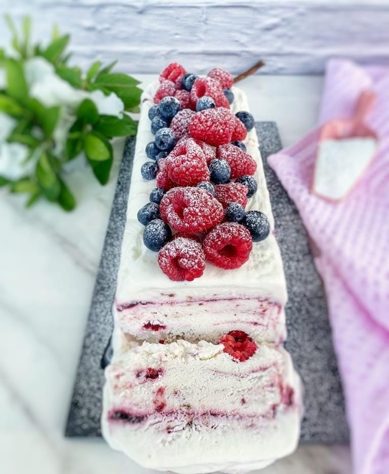 Ci occorreranno 300 g di yogurt bianco, 200 g di mascarpone, 300 ml di panna fresca, 200 g di lamponi e 100 g di mirtilli, 170 g di zucchero a velo, 80 g di albumi ( corrispondono approssimativamente a un uovo grande o due uova piccole) 6 biscotti sbriciolati, (vanno bene dei biscotti secchi o i classici frollini ) 3 cucchiai di confettura di lamponi e il succo di mezzo limone.