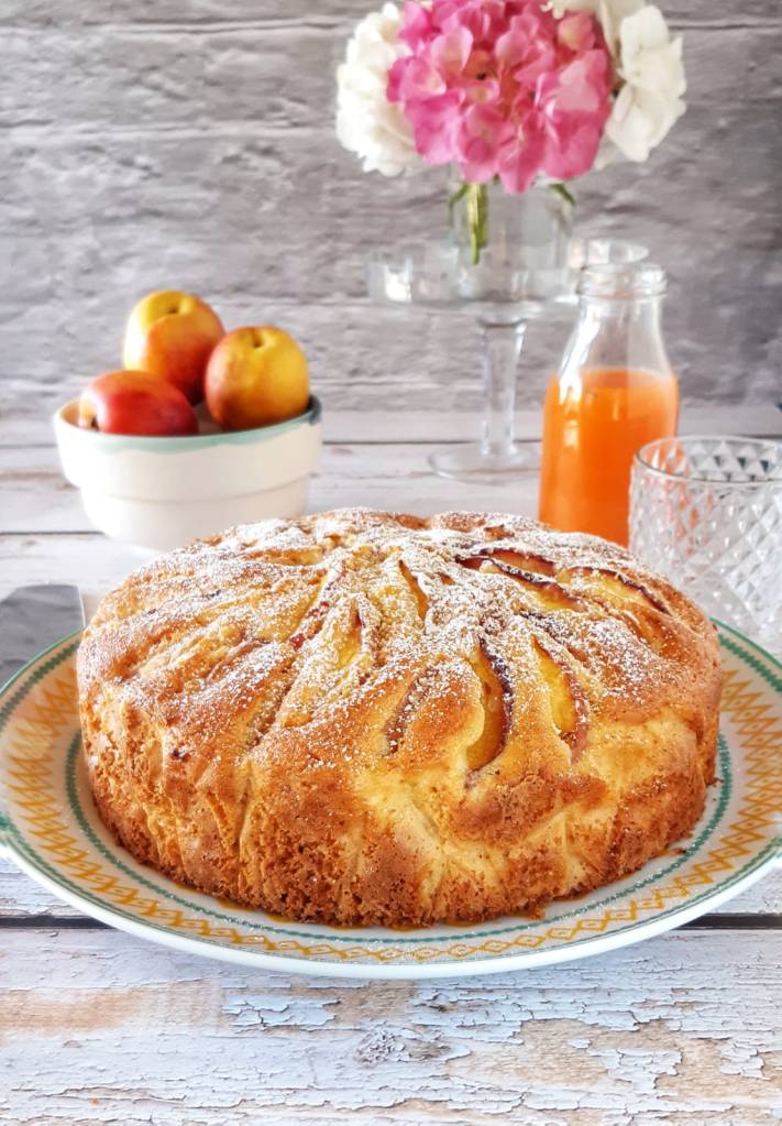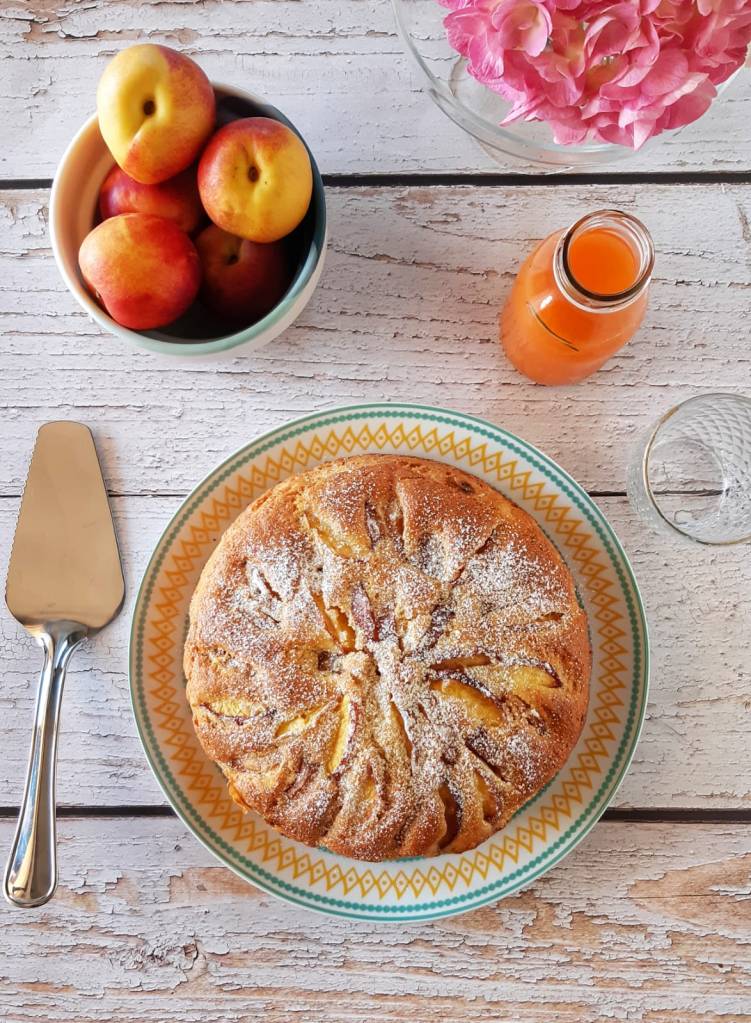 Volete la ricetta ? Eccola. Prepariamo 350 g di farina 0 , una bustina di lievito per dolci , 70 g di olio di girasole , 120 g d’ acqua , 3 uova , 5 pesche ridotte a purea , la scorza di un limone grattugiata e 200 g di zucchero.