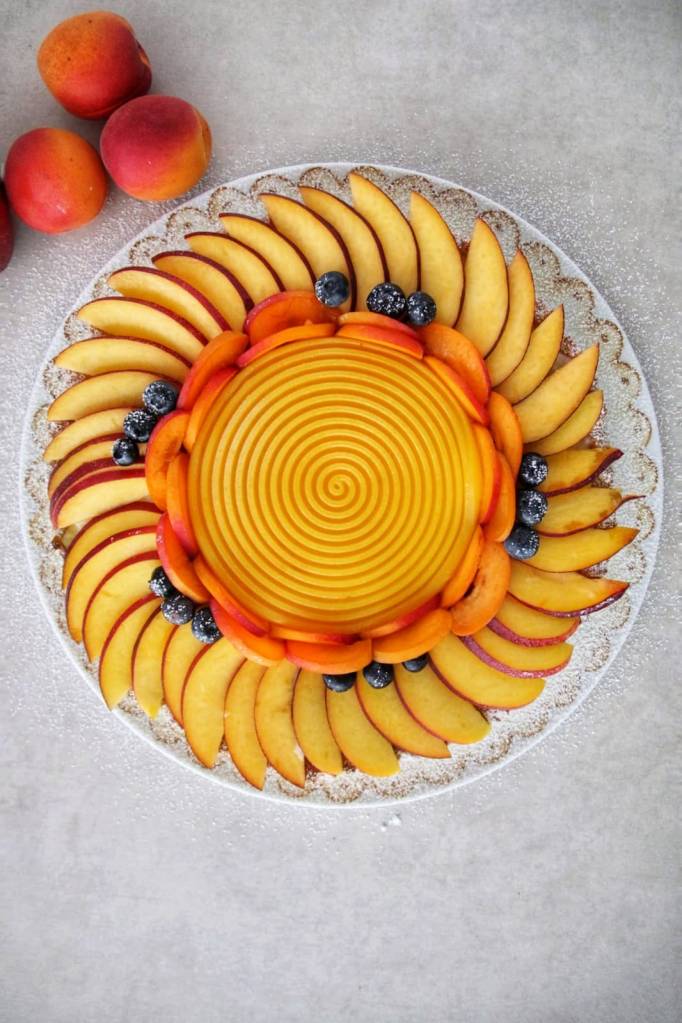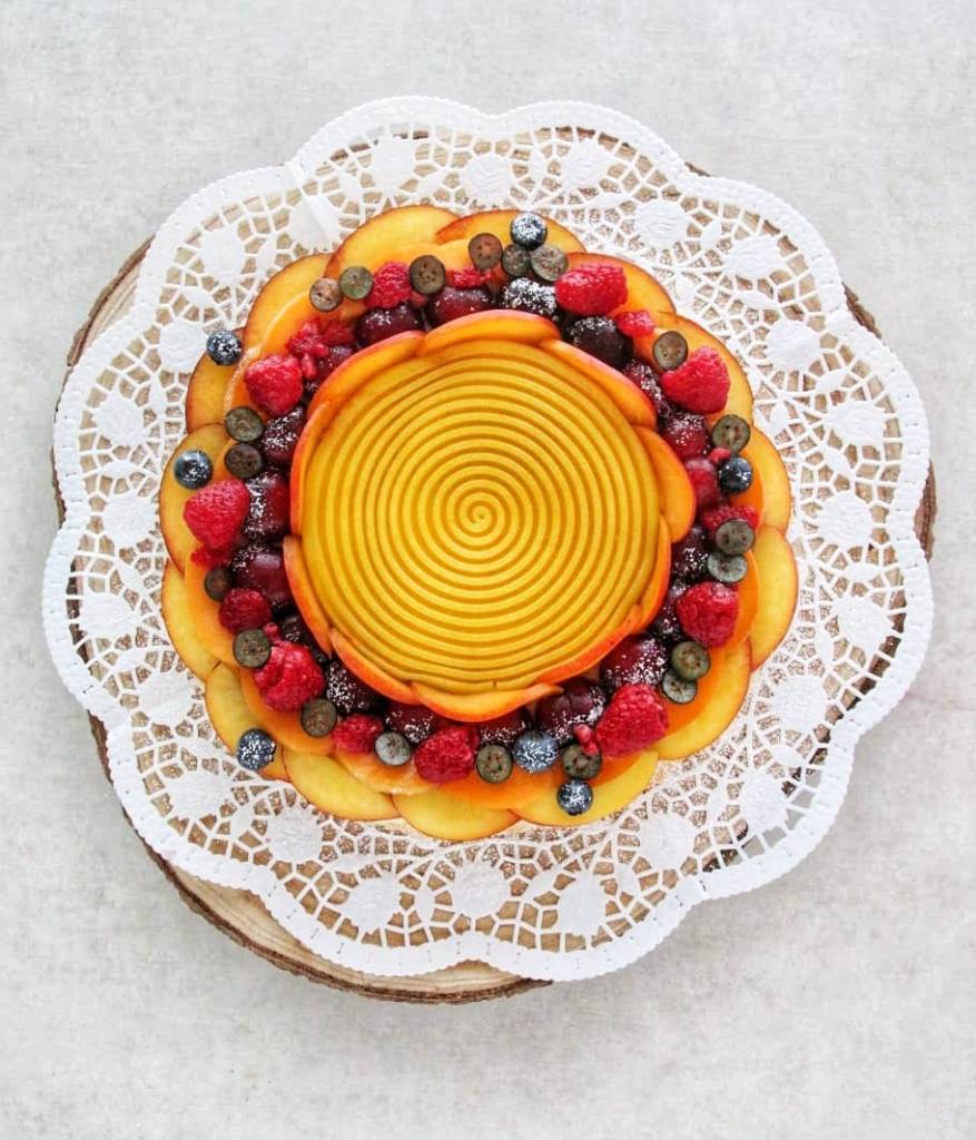 Farciamo la nostra crostata con la crema pasticcera vegana, adagiamo sopra il geleé al mango e decoriamo con la frutta a piacere.