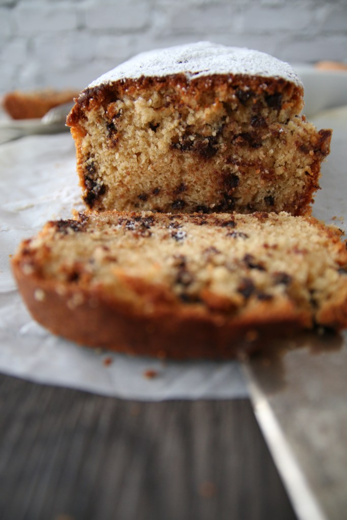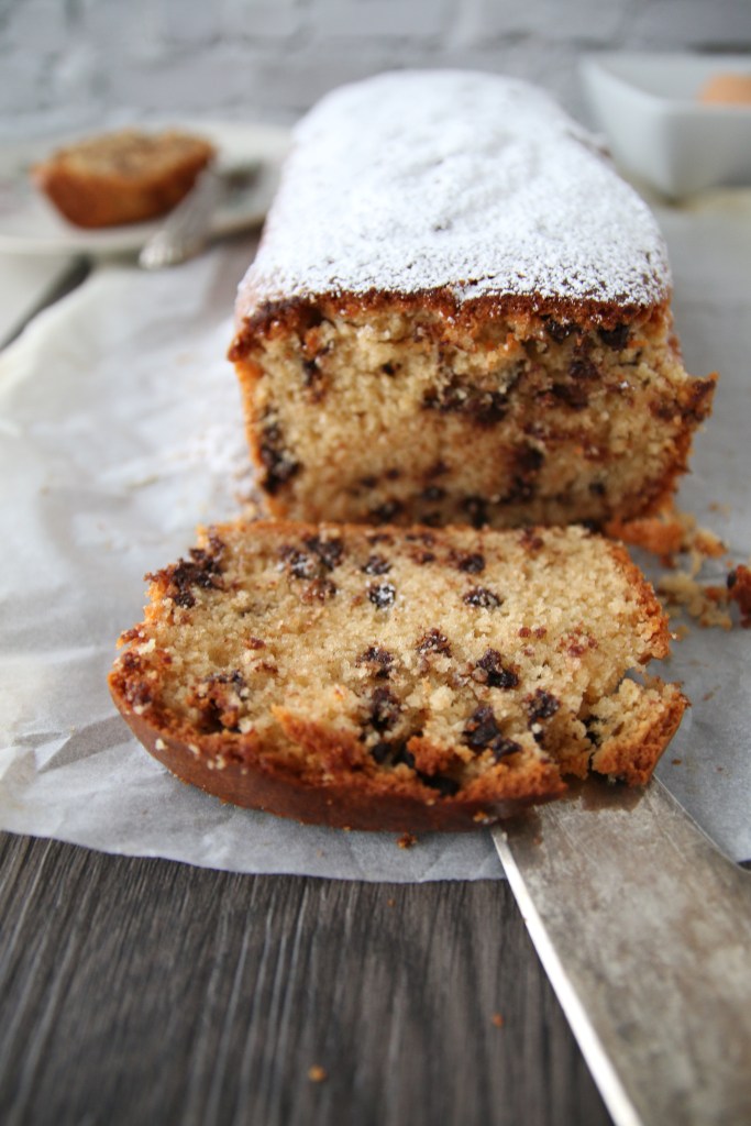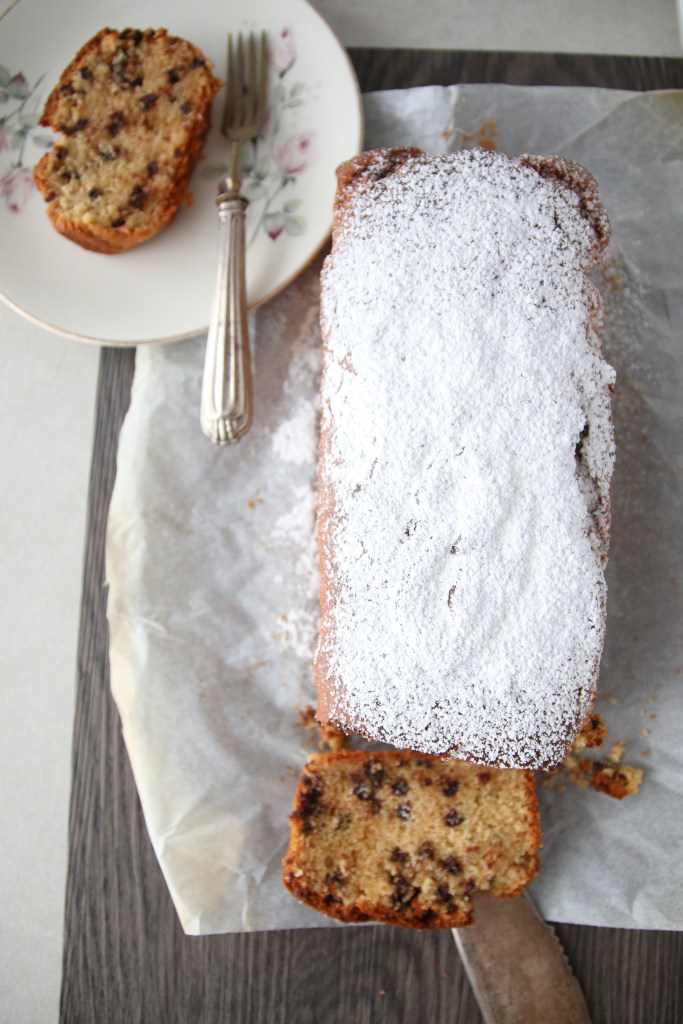 Aggiungiamo la farina precedentemente setacciata con il lievito e incorporiamo le gocce di cioccolato, mescolando delicatamente. Versiamo il composto in uno stampo da plumcake foderato con carta forno.