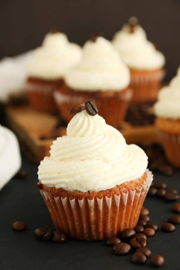 Ora assembliamo i nostri cupcakes. Una volta che i muffins saranno freddi, decoriamoli a piacere con il frosting e ultimiamo con dei chicchi di caffè.