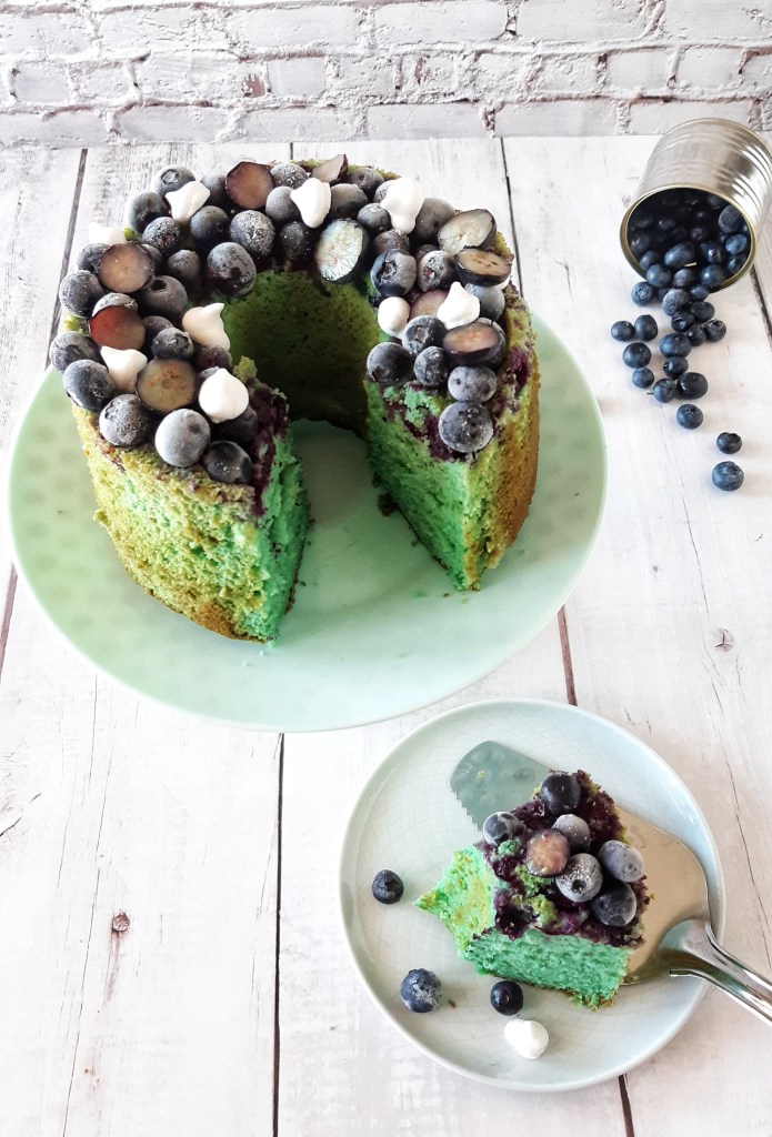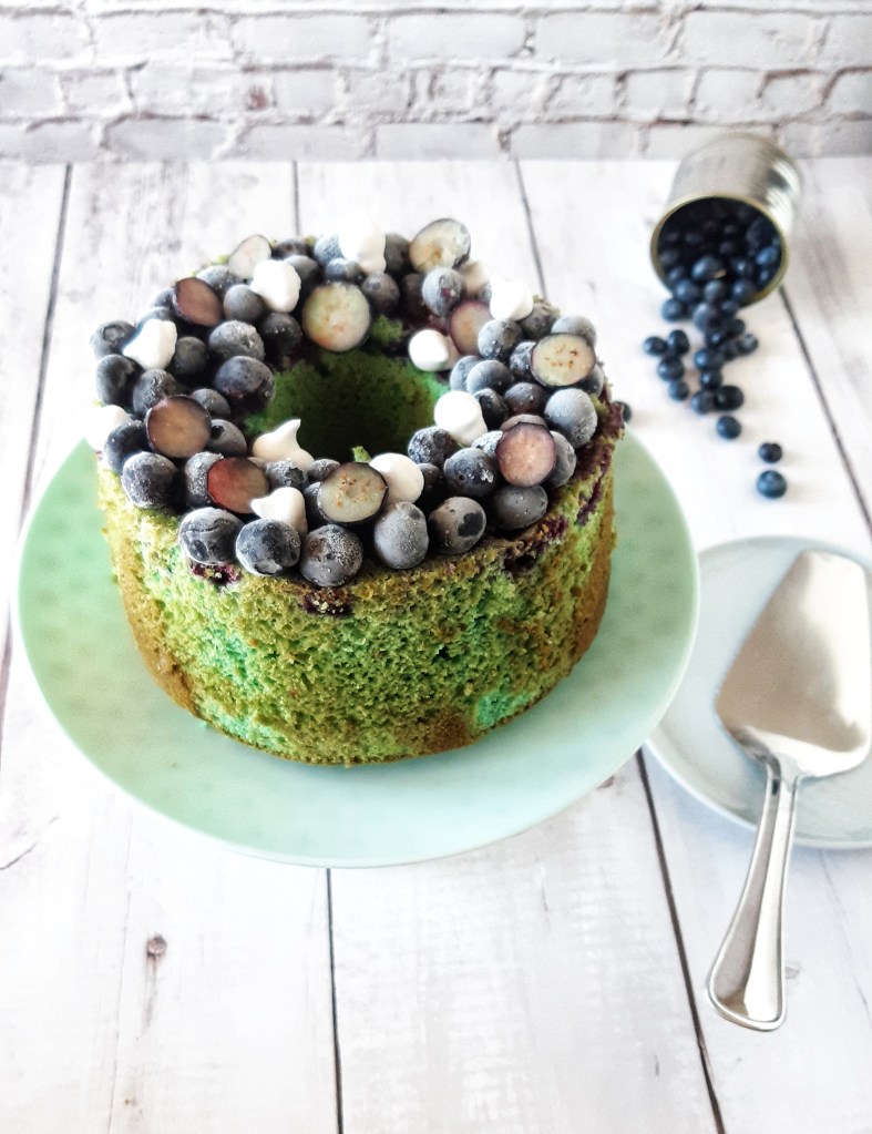 La CHIFFON CAKE ALLA SPIRULINA E MIRTILLI è frutto della bizzarra idea di utilizzare questo super alimento molto in voga , definito “il cibo del futuro ” , come colorante naturale per una semplice chiffon ai mirtilli con il retrogusto di vaniglia.