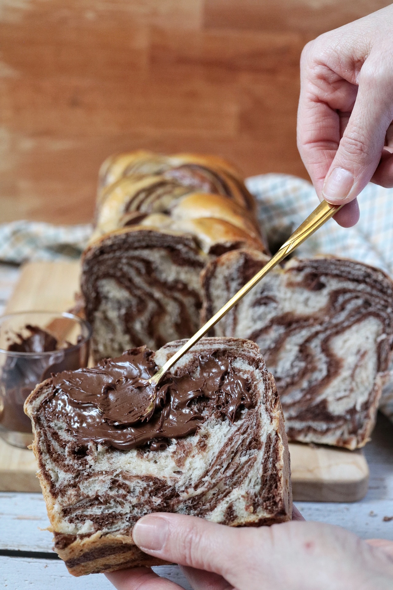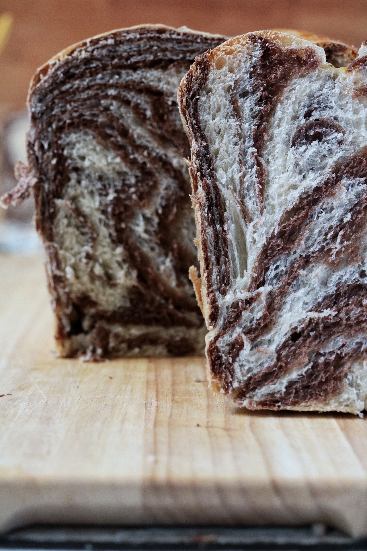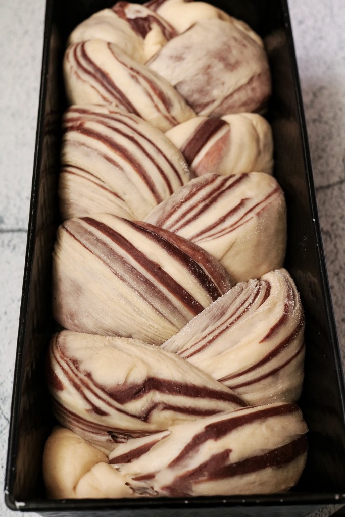 Trascorso il tempo di lievitazione, infariniamo il piano di lavoro e stendiamo prima l’impasto bianco in un rettangolo più grande. Poi stendiamo l’impasto al cacao in un rettangolo leggermente più piccolo. Sovrapponiamo l’impasto al cacao a quello bianco e pieghiamo a metà (a libro per intenderci) e con un mattarello comprimiamo bene gli strati. A questo punto ripieghiamo ancora metà e di nuovo compriamo con un mattarello. Ripetiamo quest’operazione per almeno tre volte, per ottenere così un impasto “zebrato”. Ripieghiamo un’ultima volta il rettangolo e con un coltello affilato tagliamo tre strisce nel senso della lunghezza. Procediamo poi a formare una treccia.