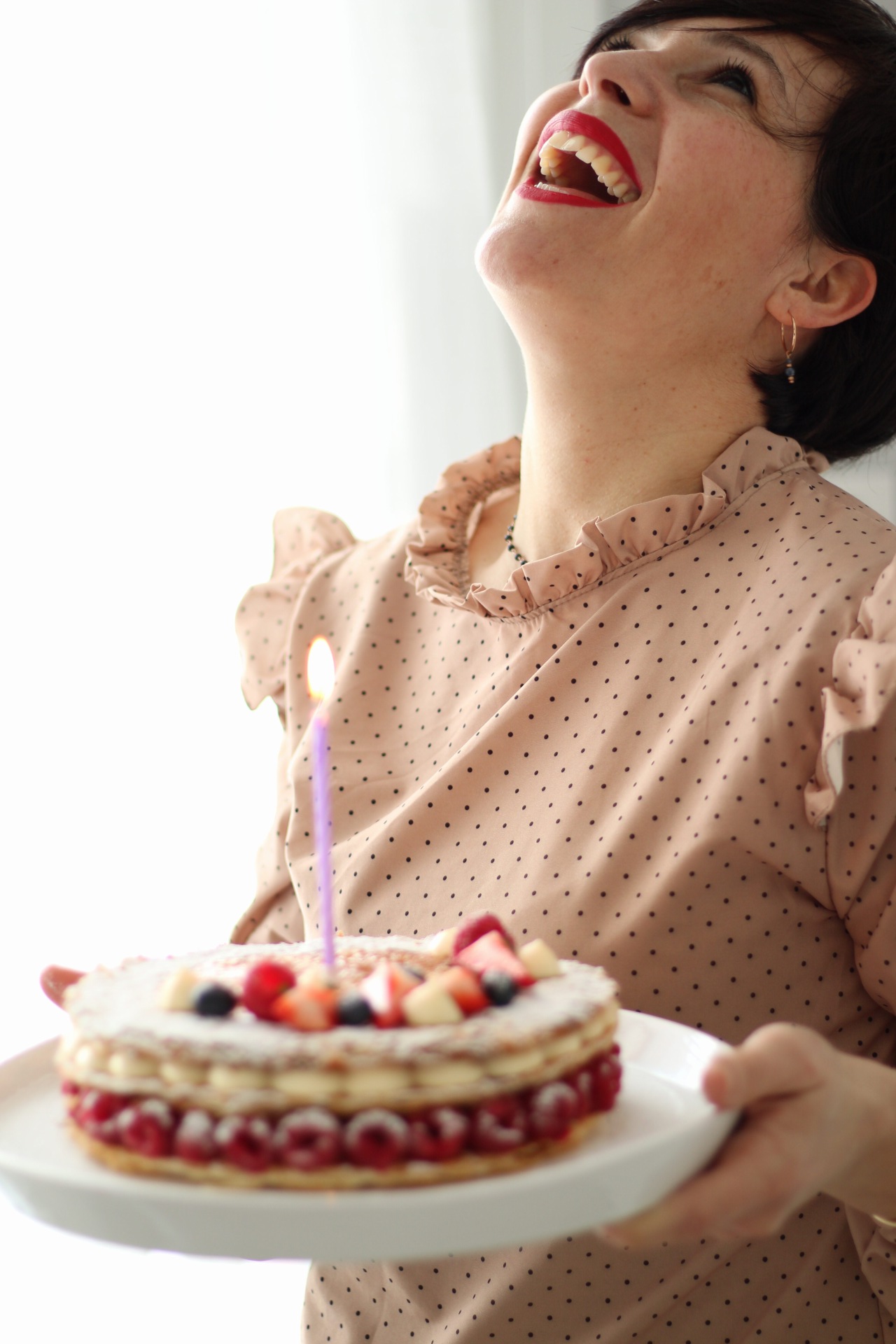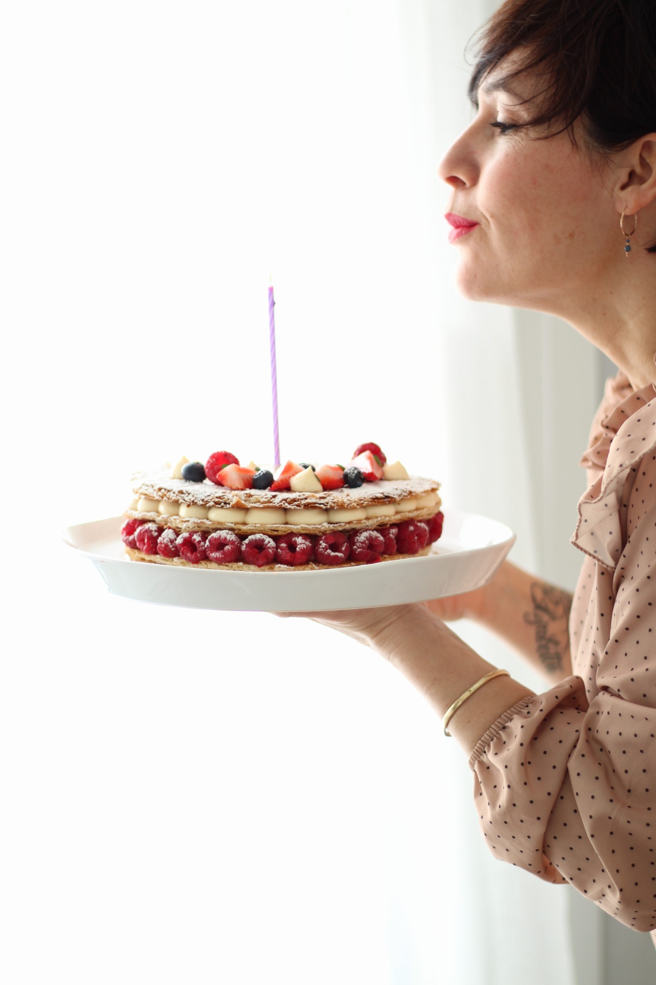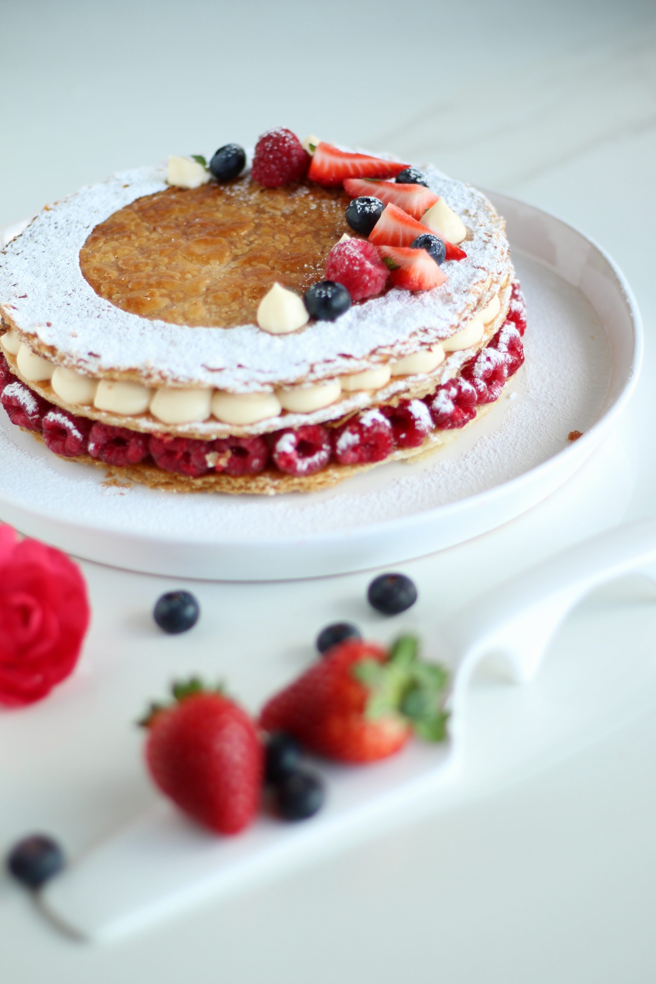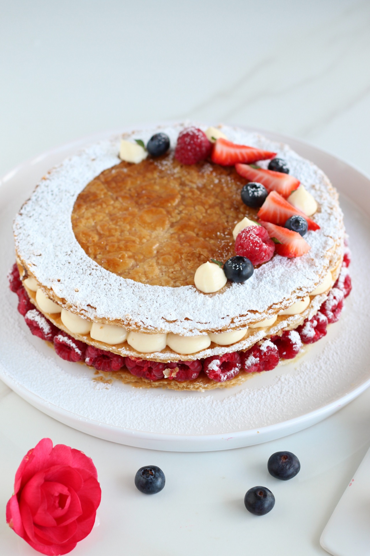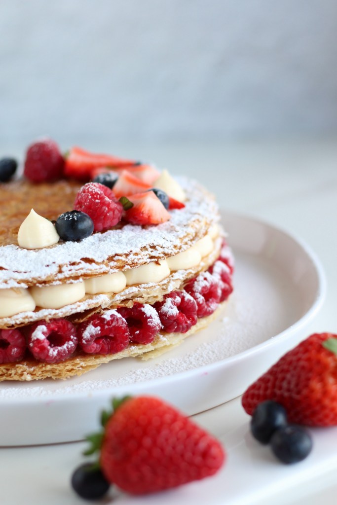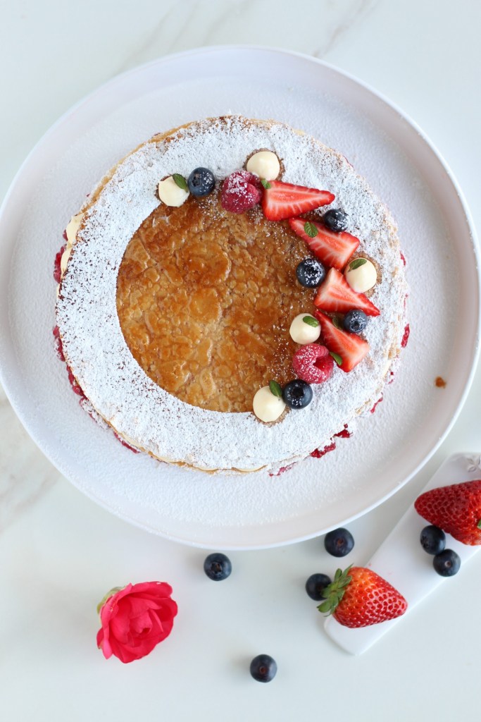 Appoggiamo il primo disco di sfoglia e decoriamolo con la nostra crema mettendo intorno all’esterno dei lamponi, copriamo con un altro disco, decoriamo con la crema diplomatica, chiudiamo con l’ultimo disco e decoriamo a piacere.