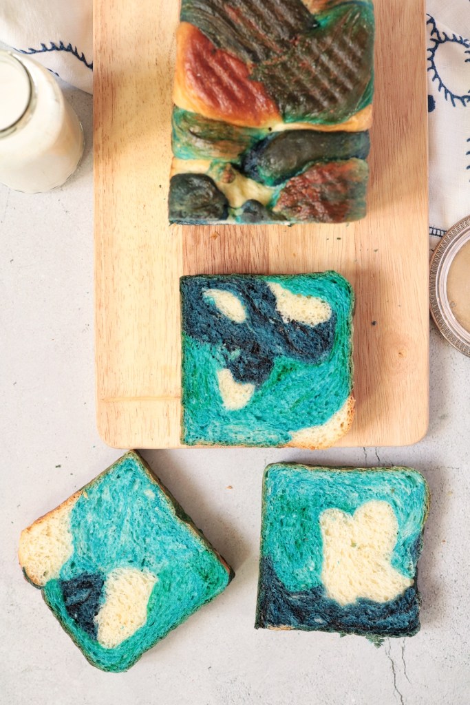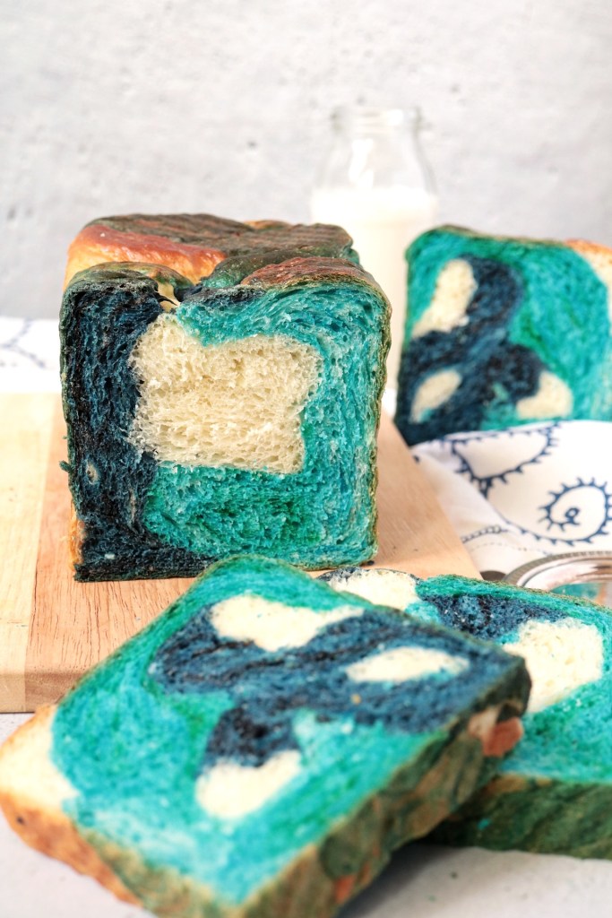 Prepararlo è davvero più semplice di quanto sembri. La ricetta base è quella dell’ hokkaido milk bread, noi abbiamo suddiviso l’impasto in quattro panetti e per ottenere delle colorazioni di gradazioni differenti abbiamo aggiunto in quantità differenti la polvere blu.