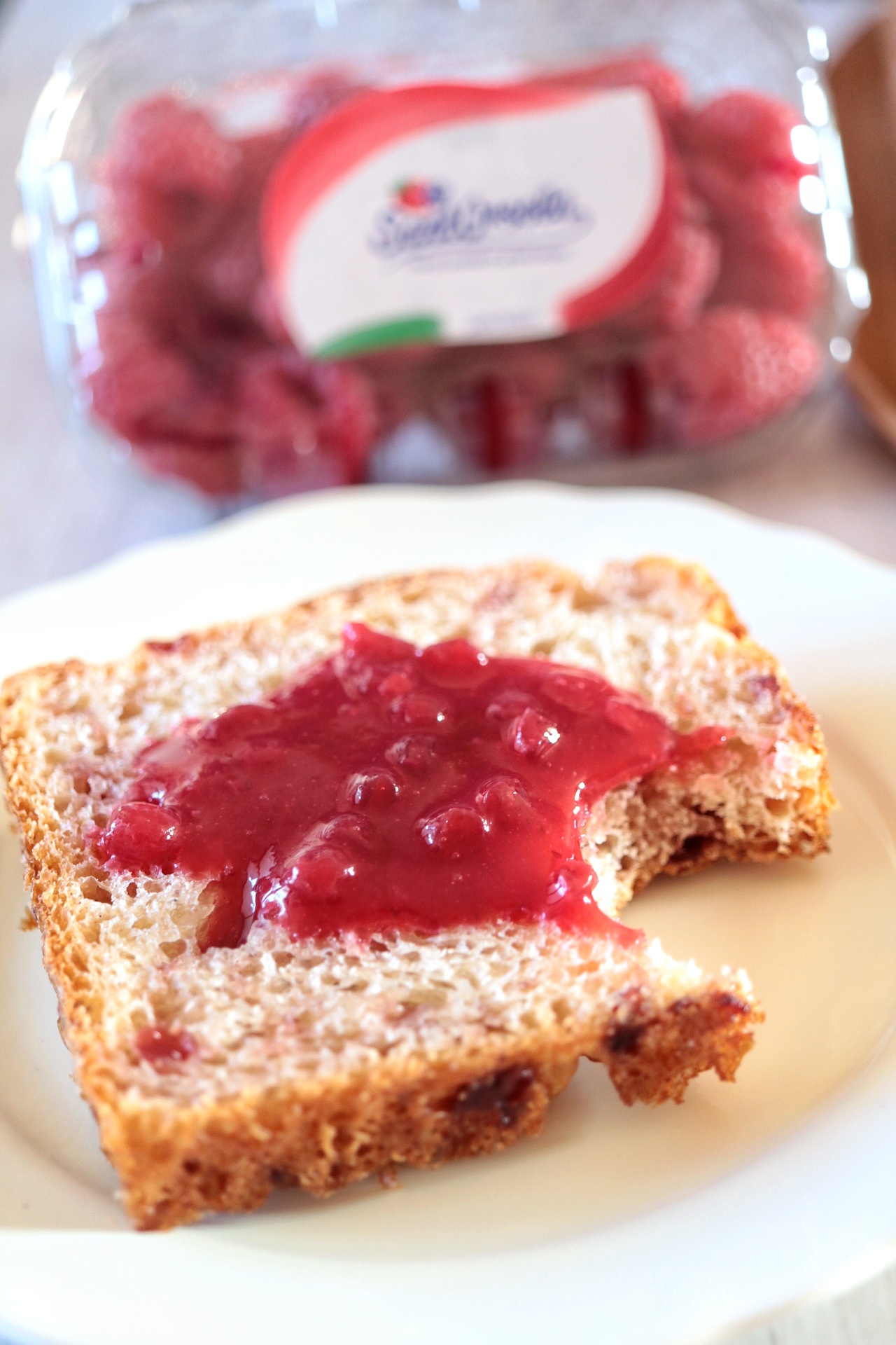 Iniziamo quindi con un PANBRIOCHE AL LATTE DI COCCO E CONFETTURA DI LAMPONI.