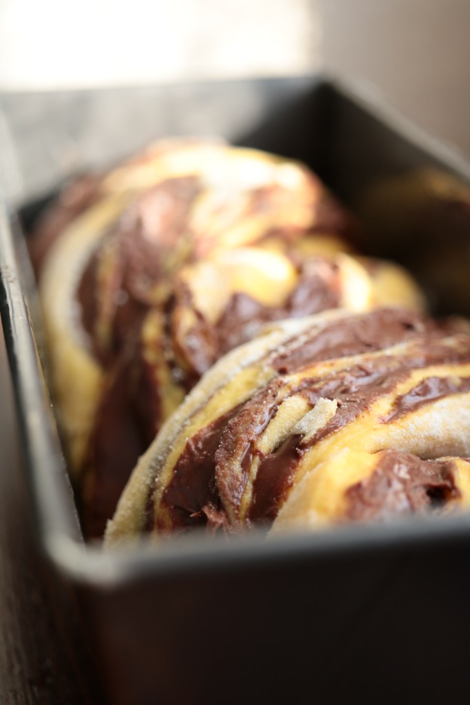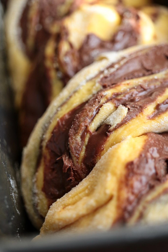 Portiamo ad incordatura, formiamo un panetto, riponiamolo in una ciotola coperta con pellicola e facciamo lievitare fino al raddoppio. Stendiamo l’impasto su un piano da lavoro leggermente infarinato, formiamo un rettangolo e ricopriamo la superficie con nutella in abbondanza.