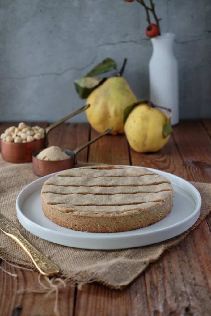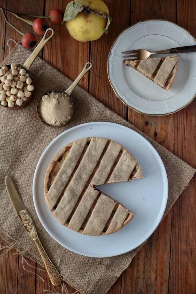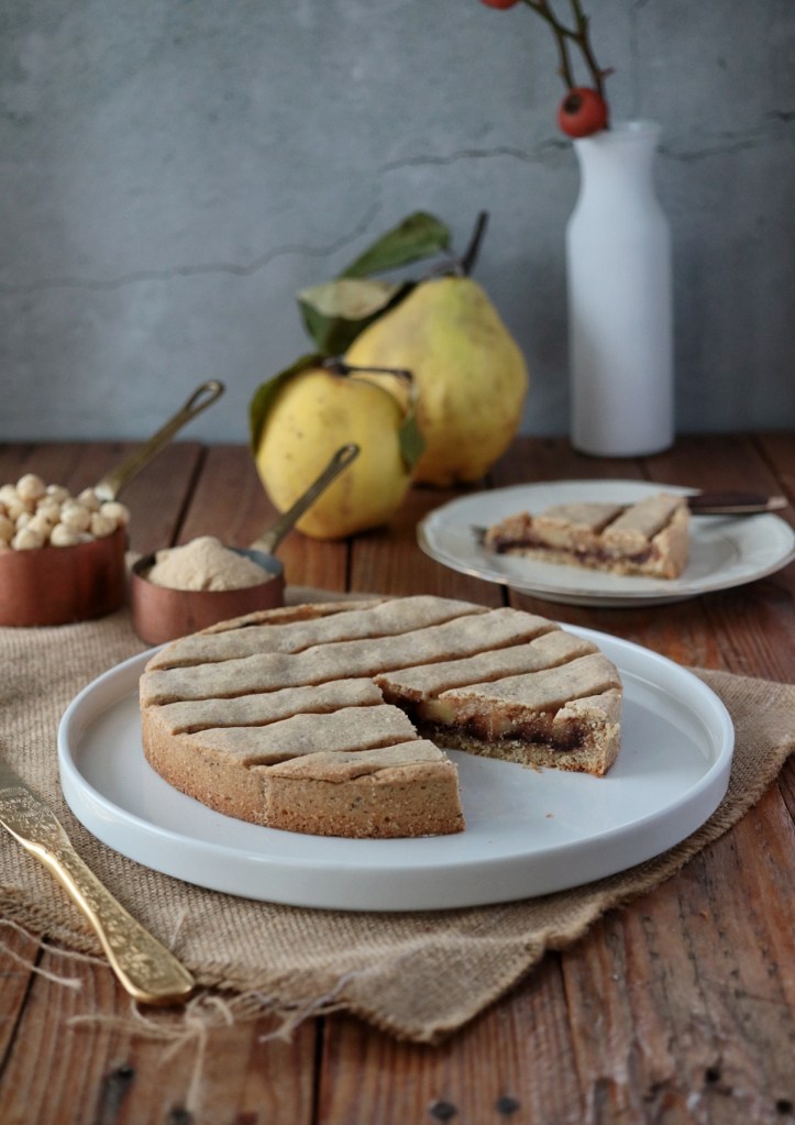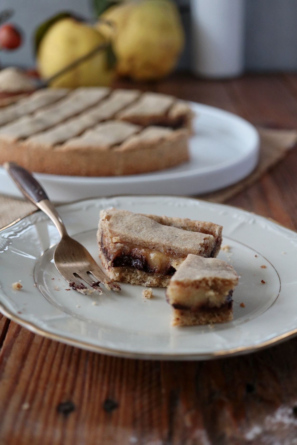 Una frolla alla nocciola e una farcia di pere cotogne e cioccolato fondente aromatizzato al miele.