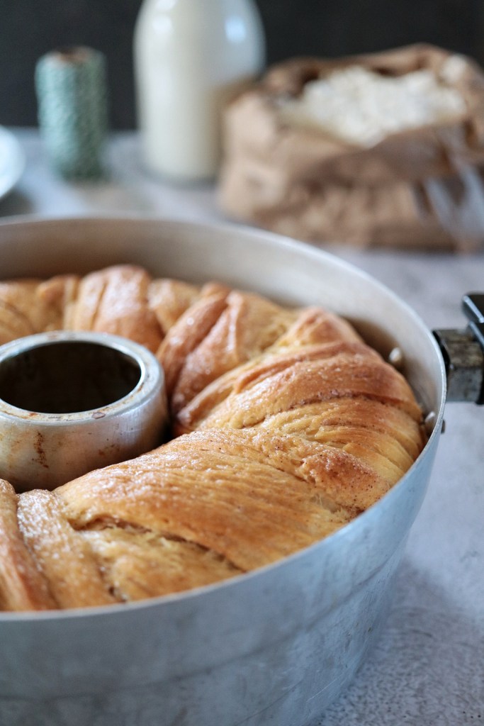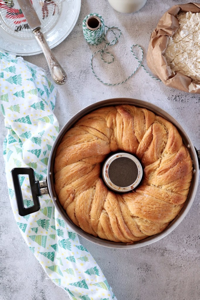 Una corona di panbrioche intrecciata, tradizionalmente preparata con uvetta e scorze d’arancia canditi, ha lasciato il posto ad una versione vegana “less is more” .