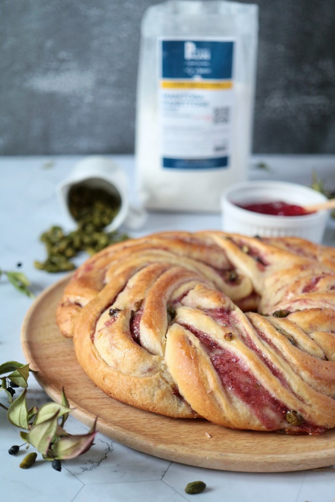 Prepariamo 300 g di farina manitoba, 125 ml di latte, 50 g di burro a temperatura ambiente, 1 uovo piccolo, 70 g di zucchero semolato, 8g di lievito di birra fresco, la scorza di un’arancia grattugiata e confettura di lamponi e pistacchi sgusciati a piacere, per farcire.