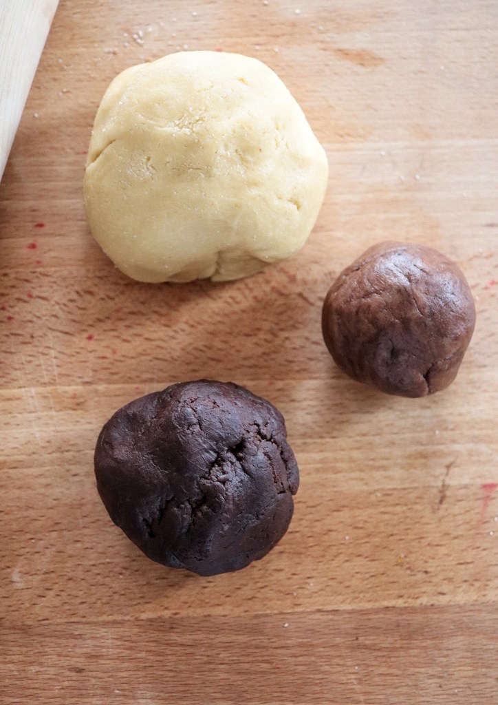 Poi formiamo un panetto da 200 g circa dove aggiungiamo i due cucchiai di cacao, formando così l’impasto più scuro e infine ci resterà un panetto da circa 100 g al quale andiamo ad aggiungere un cucchiaino di cacao, ottenendo una tonalità più chiara.