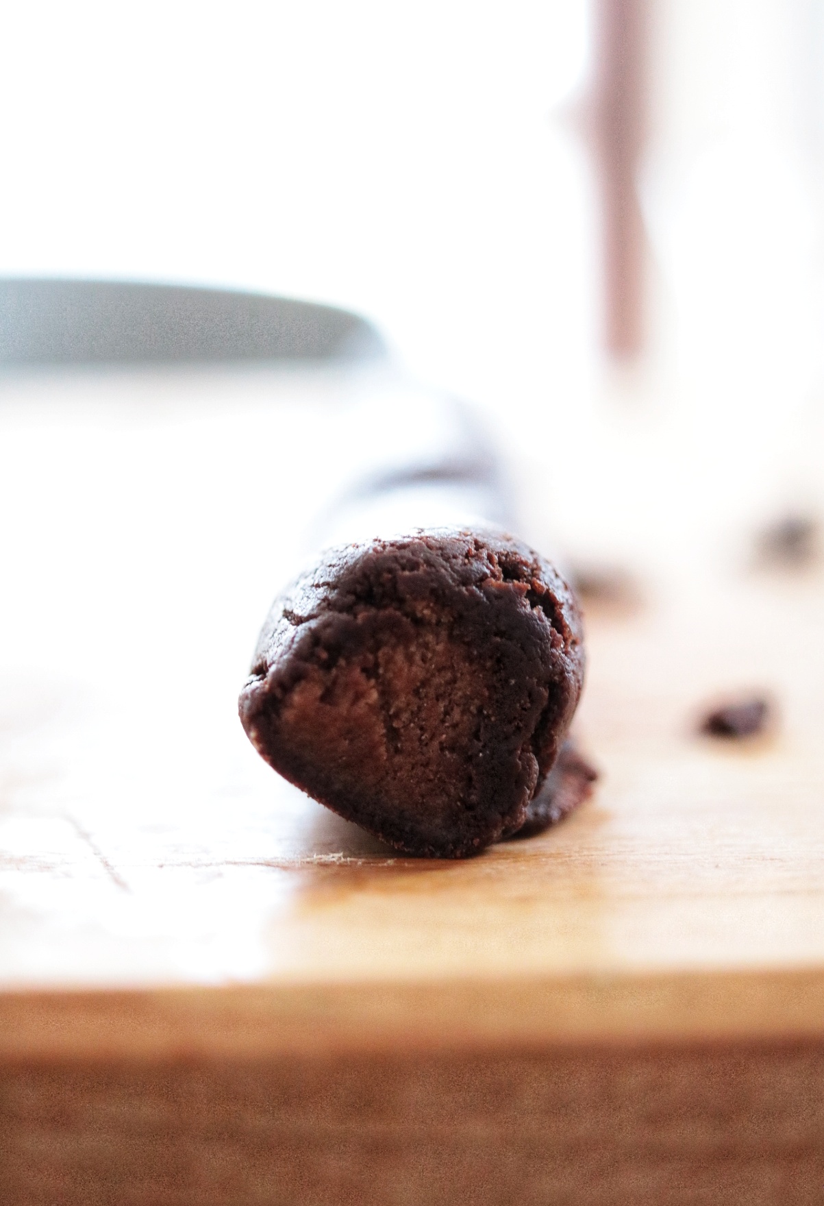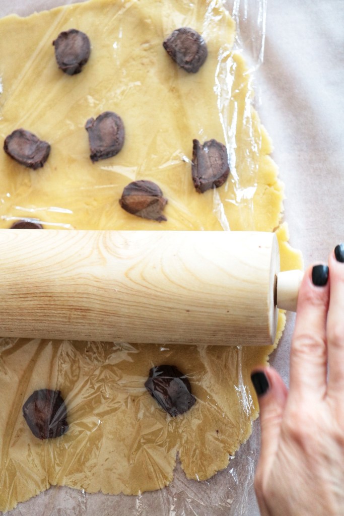 Stendiamo l’impasto bianco con un mattarello su un piano da lavoro, prendiamo il cilindro dal freezer e lo tagliamo a fettine sottili.