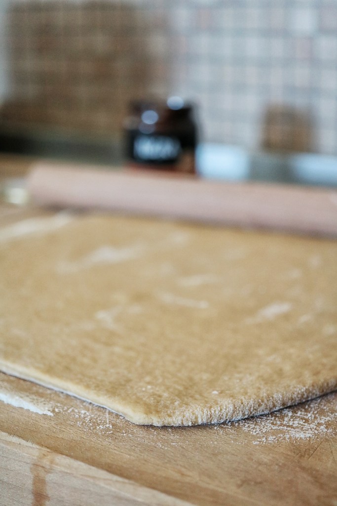 Stendiamo il nostro impasto su un piano di lavoro leggermente infarinato, con l’aiuto di un mattarello stendiamo formando così un rettangolo.