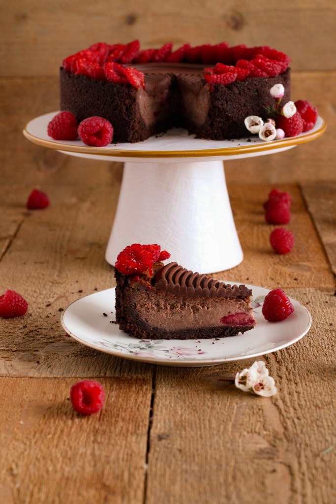 Per la crema prepariamo 250 g di mascarpone, 250 g di ricotta, 100 g di yogurt bianco, 150 ml di panna fresca, 160 g di zucchero, 3 uova, un chucchiaio di farina, 1 cucchiaio di cacao amaro, 100 g di cioccolato fondente 75% fuso e 125 g di lamponi.