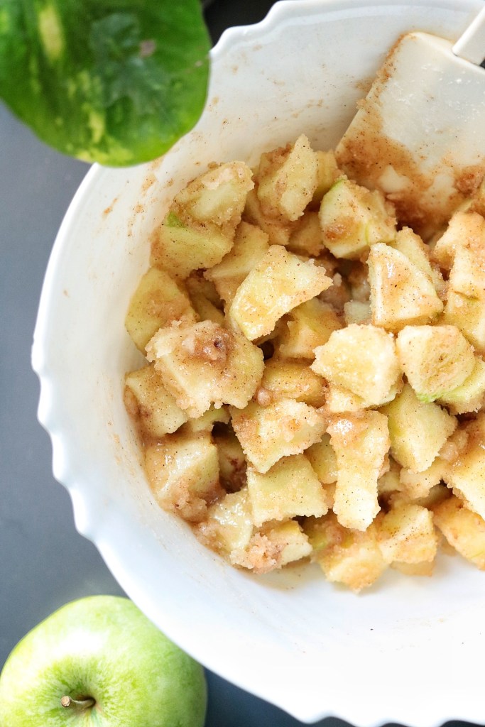 Sbucciamo e tagliamo le mele a tocchetti e riponiamole in una ciotola capiente.