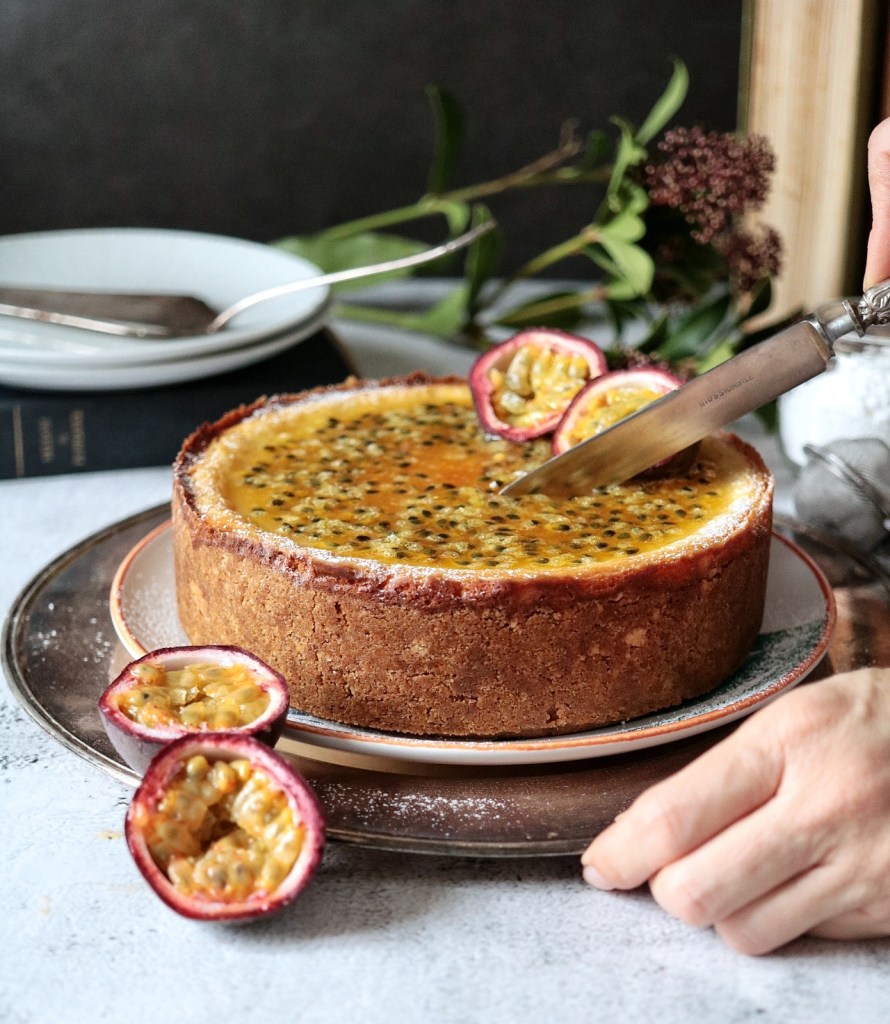 Versare sulla superficie della cheesecake oramai raffreddata e decorare a piacere con maracuja e una spolverata di zucchero a velo.