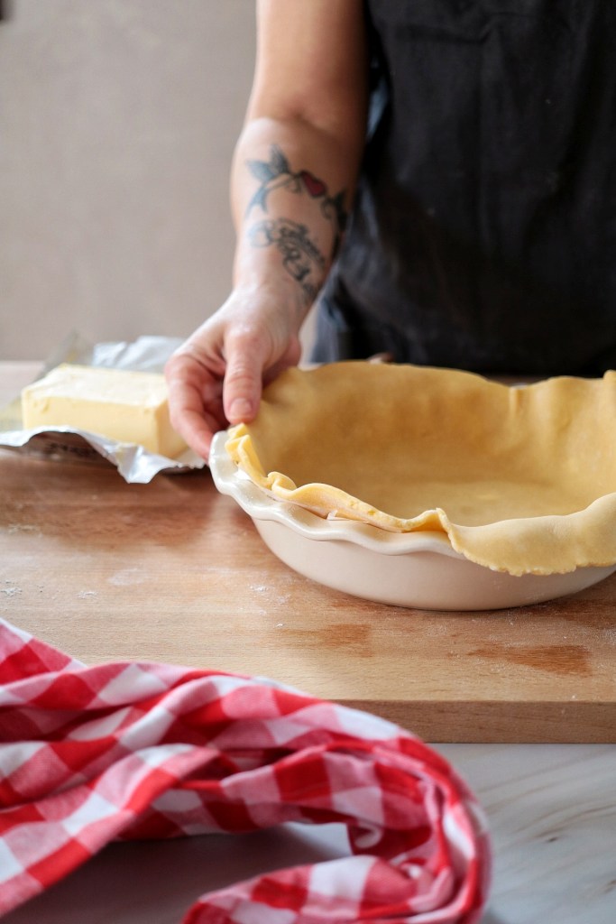 Foderiamo il fondo di una teglia da 22cm di diametro, precedentemente rivestito con un foglio di carta forno, bucherelliamo con una forchetta e versiamo all’interno il ripieno. Noi abbiamo usato lo stampo in ceramica di Emile Henry, che potete trovare sulla nostra vetrina Amazon.