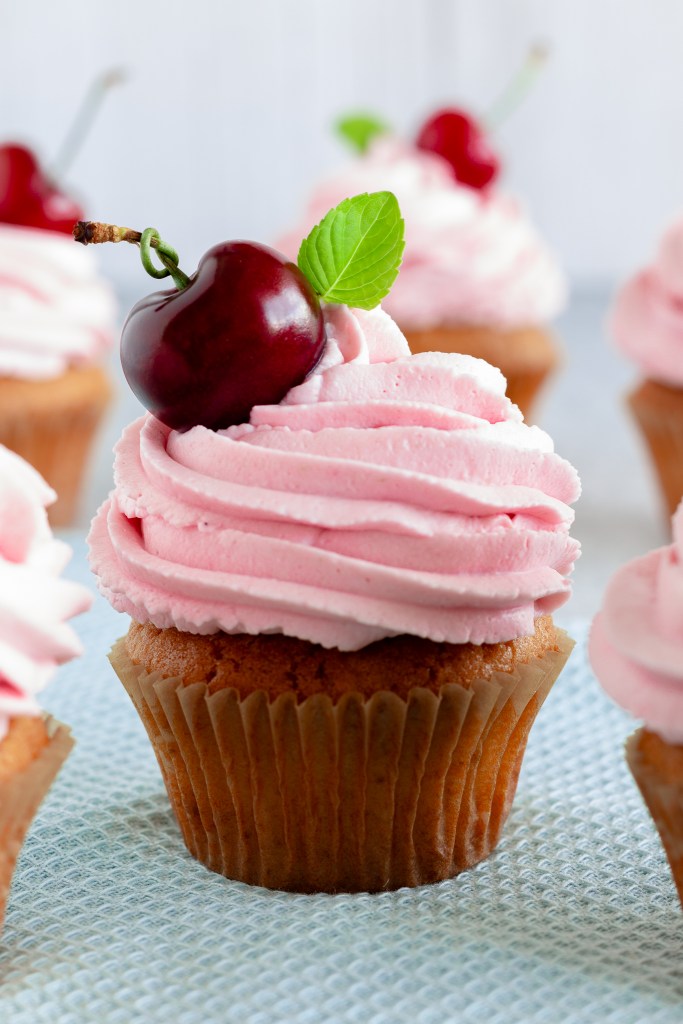 Riempiamo una sac a poche con il frosting, decoriamo a piacere ed abbelliamo con ciliegie fresche.