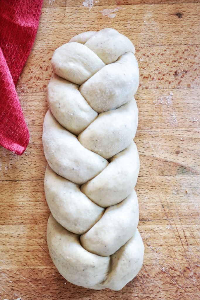 Intrecciaamo e mettiamo nello stampo, lasciando lievitare per un’altra ora.