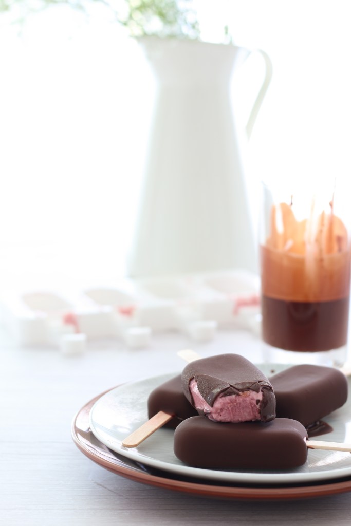 Trascorso il tempo di raffreddamento, facciamo sciogliere il cioccolato a bagnomaria con il burro di cacao , togliamo i gelati dagli stampi e ricopriamoli con il cioccolato fuso.