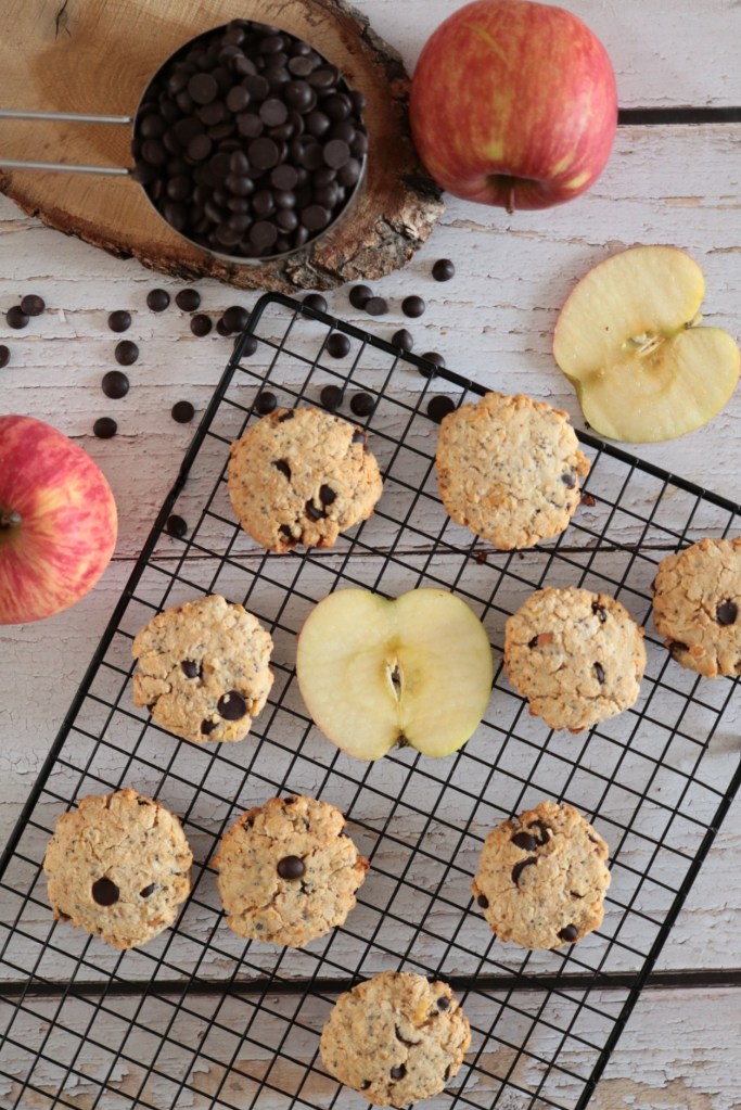 Questi BISCOTTI VEG e SENZA GLUTINE ALLA MELA, sono completamente privi di zucchero, ma tanto dolci golosi grazie alla mela e alle gocce di cioccolato fondente.
