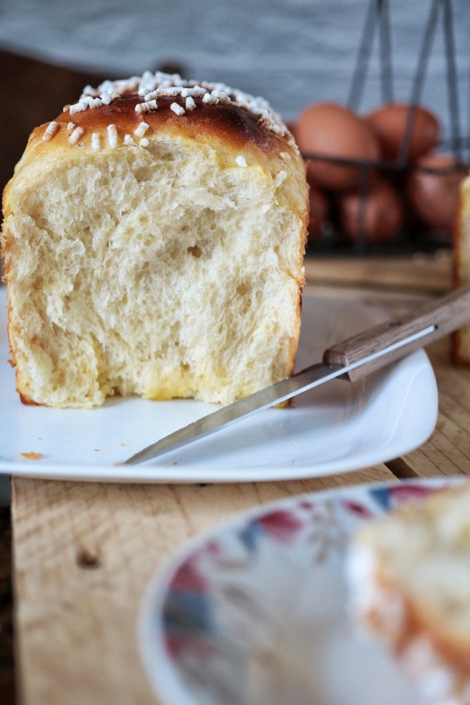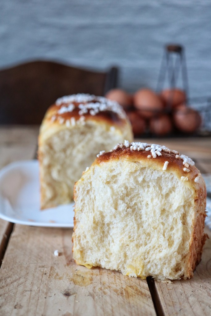 Dopo la seconda lievitazione, spennelliamo il panbrioche con un tuorlo d’uovo e un goccio di latte, se è di vostro gradimento potete cospargere la superficie con granella di zucchero prima d’infornarlo.
