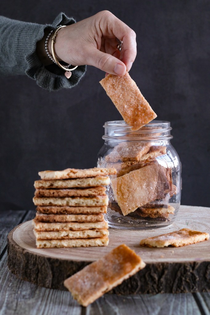 Una volta freddo stendiamo la frolla in uno strato sottile di circa 3/4 mm, tra due fogli di carta forno, tagliamoli a rettangoli lasciandoli uniti, spennelliamo con l’albume e dopodiché spolverizziamo con lo zucchero.