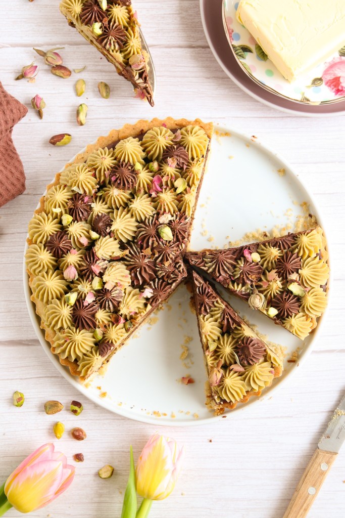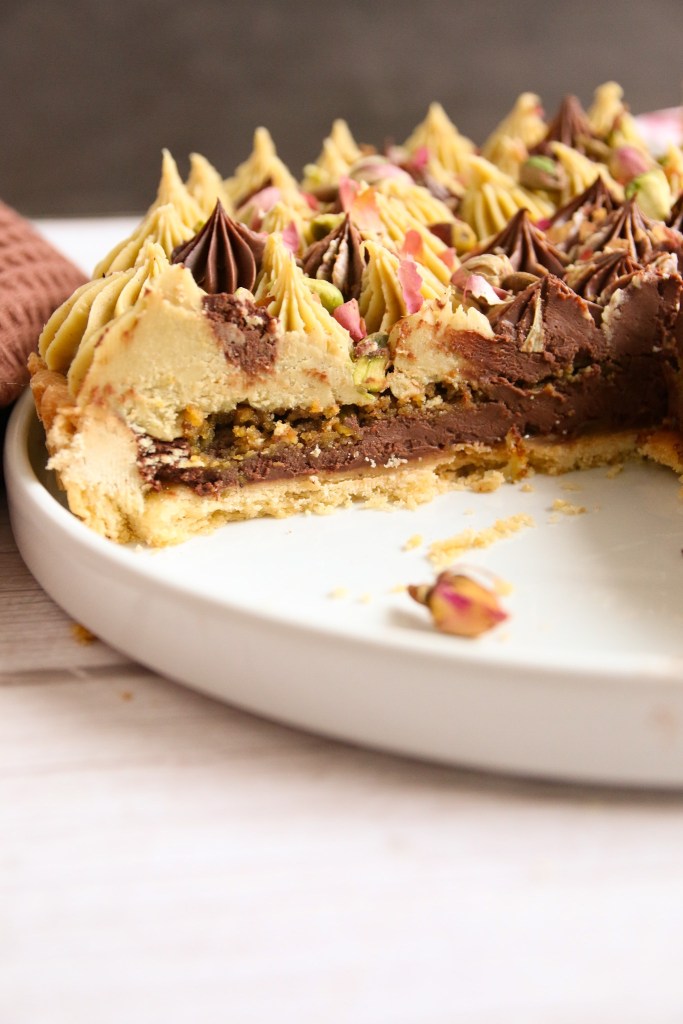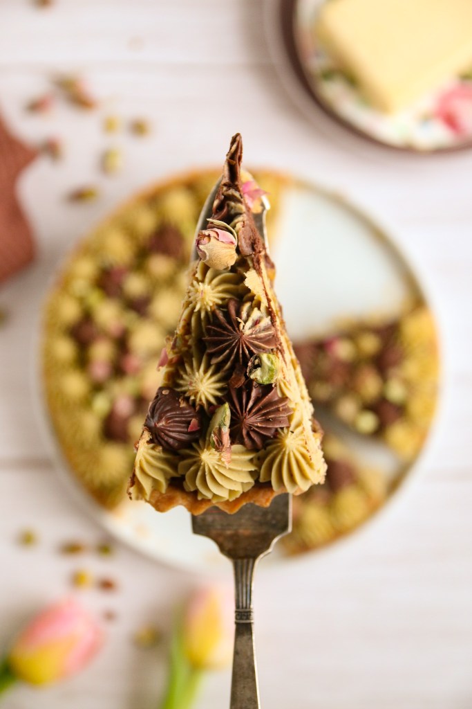 Una crostata con pasta sablè di pistacchi e mandorle, con crema ganache al pistacchio e crema ganache al cioccolato fondente…… un dolce semplicemente fantastico!