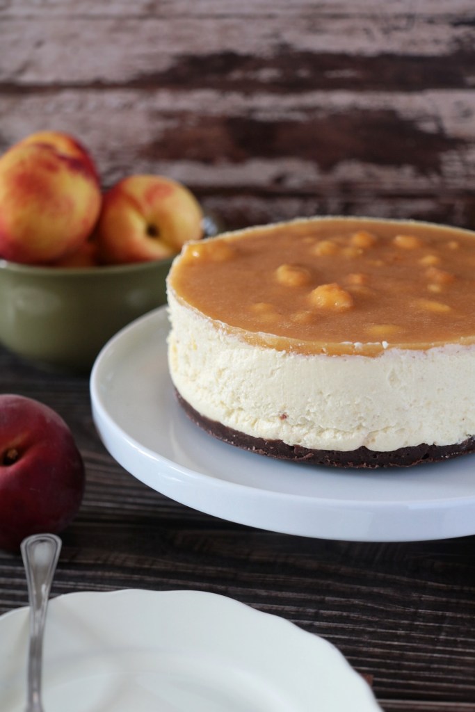 Cospargiamo la superficie della cheesecake con la salsina alle pesche e decoriamo a piacere.