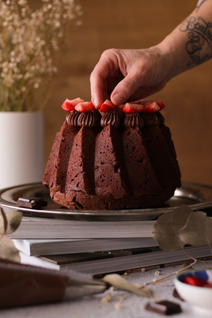 Lasciamo rassodare la crema prima di utilizzarla, poi con l’aiuto di una sac a poche decoriamo a piacere la bundt e abbelliamola con le fragole fresche.