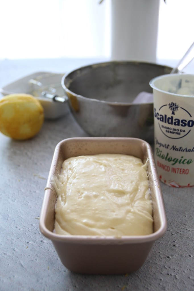 Lavoriamo le uova con lo zucchero fino a ottenere un composto chiaro spumoso, aggiungiamo la scorza del limone, lo yogurt, la farina setacciata con il lievito e infine incorporiamo il burro.