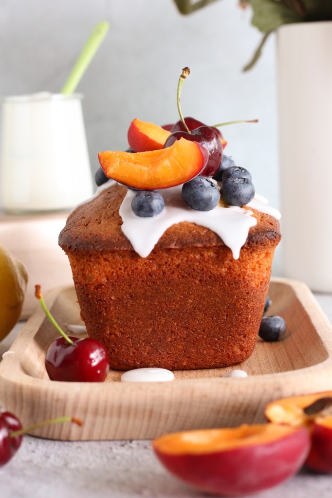 Ecco come vi presentiamo il nostro PLUMCAKE CON YOGURT decorato con glassa bianca e frutta fresca.