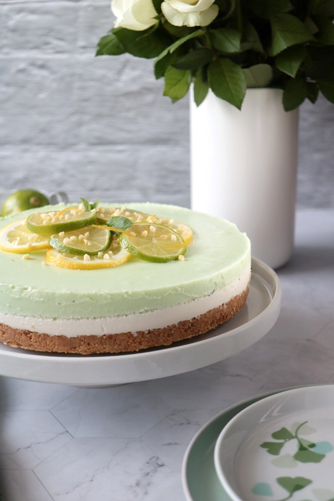 Per la crema ci occorreranno 400 g di formaggio spalmabile tipo philadelphia, 500 g di panna fresca, 12 g di fogli di gelatina, 150 g di zucchero a velo, il succo di 2 lime, la scorza di 1 lime, 80 ml di gin e un goccio di colorante alimentare liquido verde.