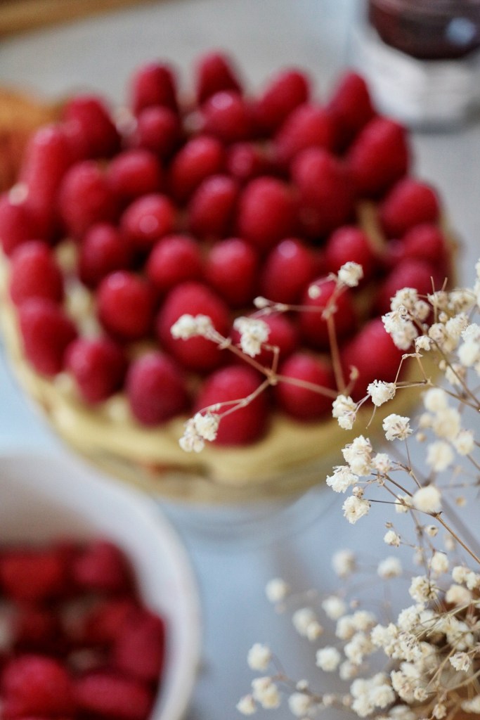 Infine concludiamo con la crema al mascarpone e rivestiamo la superficie con tanti lamponi freschi.