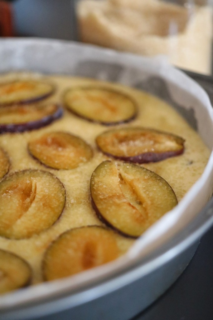 Tagliamo a fettine le prugne rimaste e decoriamo la superficie della torta, cospargiamo con zucchero di canna e cuociamo a 180° per circa 35/40′.