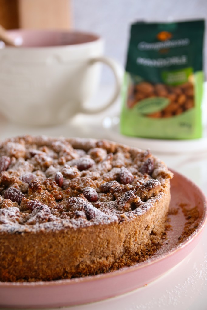 Cospargiamo poi con altro zucchero di canna la superficie e aggiungiamo qualche mandorla.