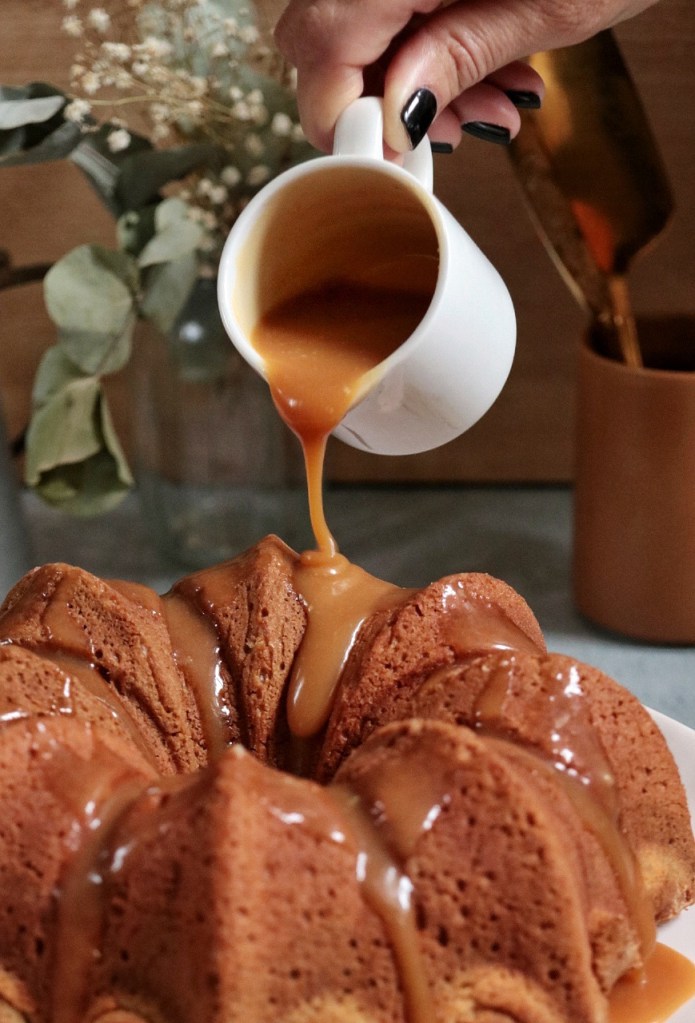 Una volta che la nostra bundt sarà completamente raffreddata, possiamo cospargerla con la salsa al caramello oppure lasciarla “al naturale ” e gustare la salsa con le singole fette di torta.