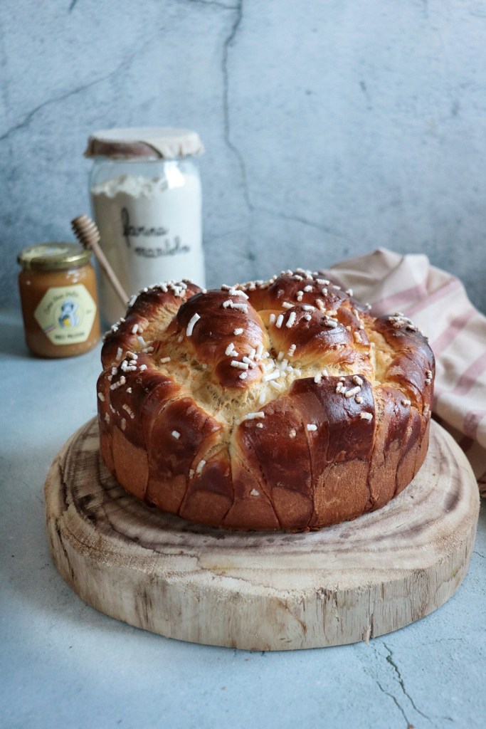 Iniziamo preparando 500 g di farina Manitoba, 180 ml di latte, 60 ml di olio di cocco o di semi, 2 uova, 50 g di zucchero, 2 cucchiai di miele millefiori e 15 g di lievito di birra fresco.