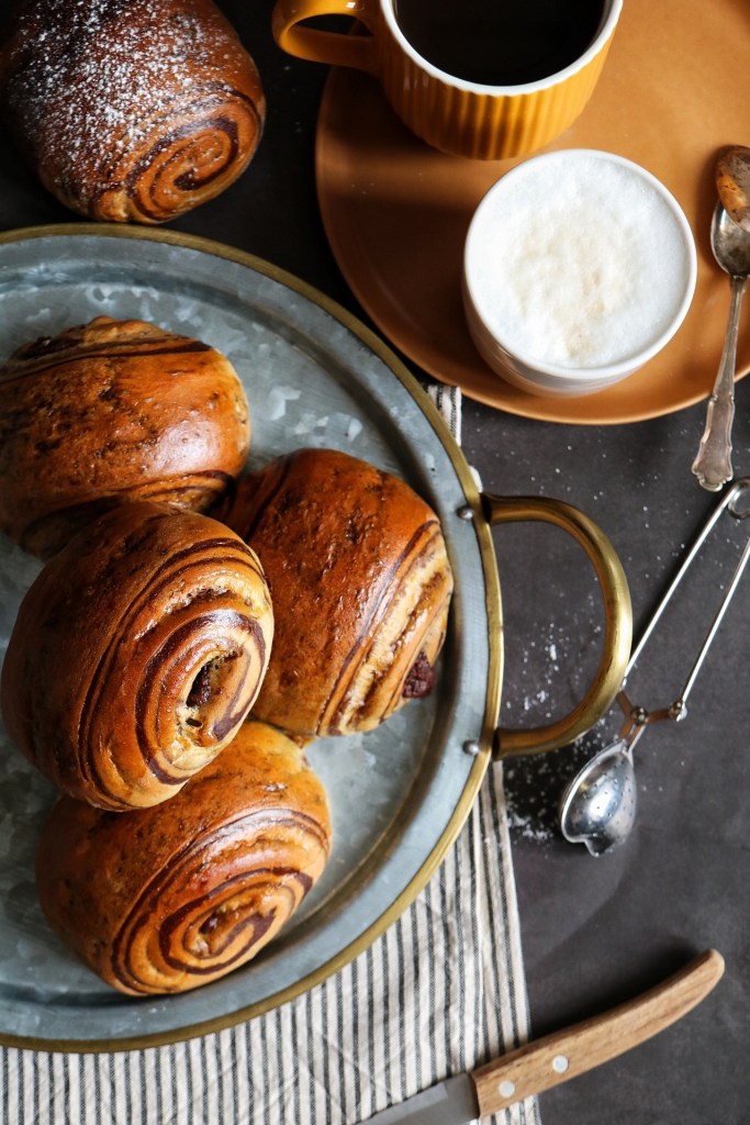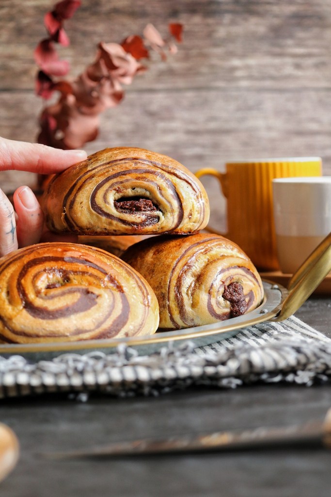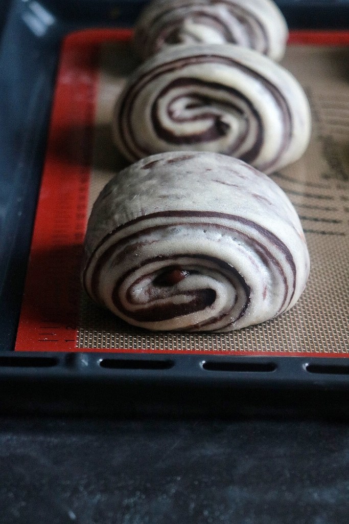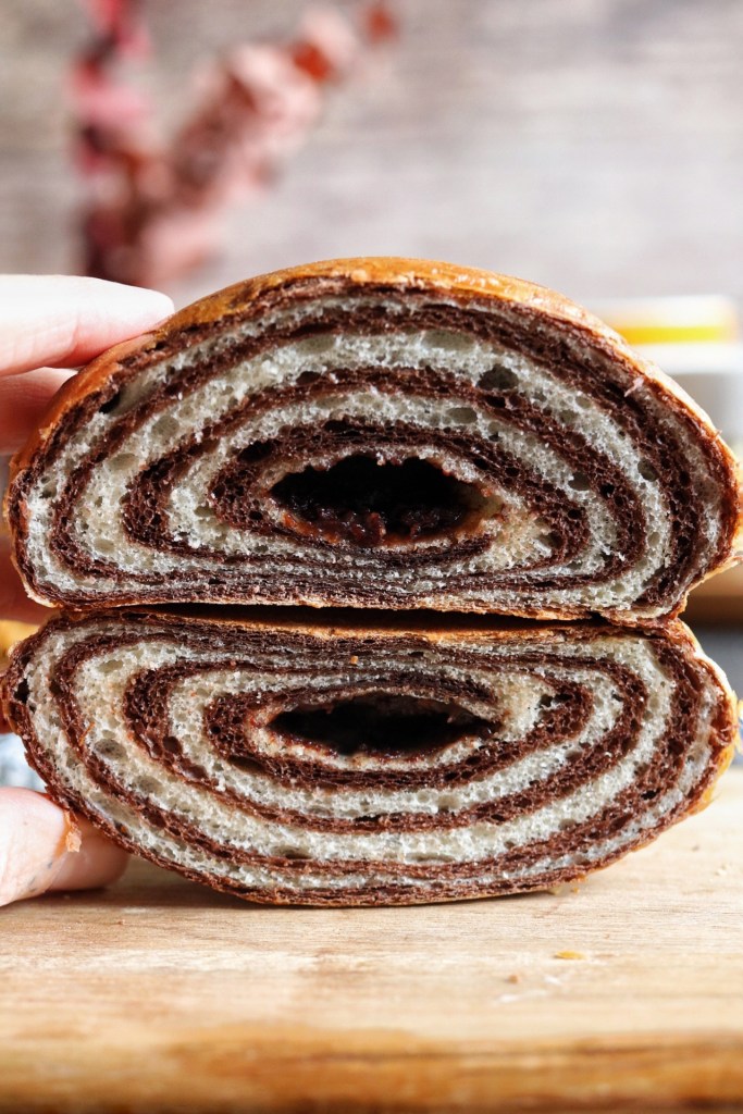 500 g di farina manitoba , 250 ml di bevanda vegetale di mandorle o se preferite latte vaccino, 100 g di zucchero , 60 g di burro, 10 g di lievito di birra fresco , 1 uovo, + per la metà d’ impasto scura, 30 g di cacao amaro e 50 ml di latte .