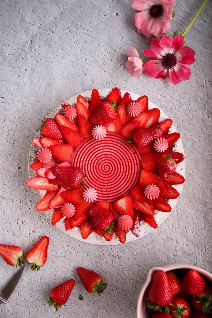 Mettiamo in ammollo in acqua fredda la gelatina in fogli, sbucciamo laviamo le fragole e frulliamole. Per ottenere una crema liscia, filtriamola con un setaccio. Preleviamo un quarto di polpa e versiamolo in una piccola pentola, uniamo lo zucchero e il cucchiaino di miele. Mescoliamo e portiamo a bollore, spegniamo il fuoco, uniamo la gelatina strizzata, mescoliamo e facciamola sciogliere. Aggiungiamo il liquido caldo, alla polpa fresca, mescoliamo bene, mettiamo nello stampo e conserviamo nel congelatore fino al momento dell’uso. Lo stampo a spirale lo potete trovare sulla nostra vetrina Amazon mentre lo stampo delle sfere è di Silikomart