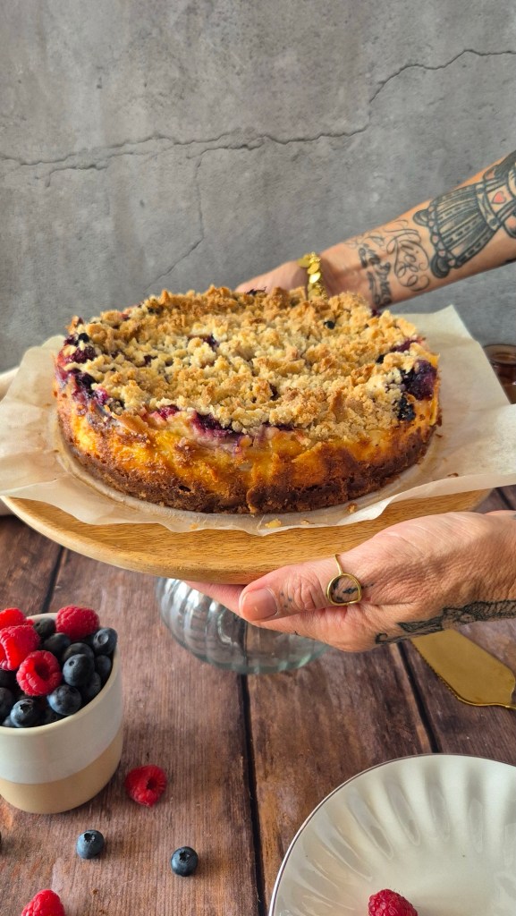 Questa cheesecake sbriciolata è un perfetto equilibrio di consistenze: la cremosità vellutata del ripieno, la freschezza vivace dei frutti di bosco e la croccantezza burrosa del crumble.