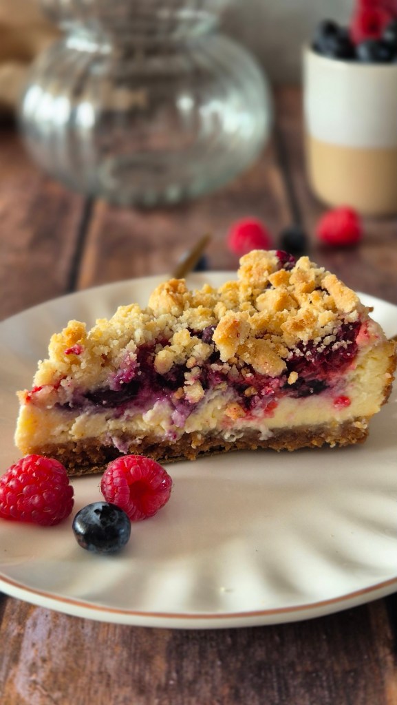 La cheesecake sbriciolata ai frutti di bosco è proprio così: cremosa, fresca e arricchita da un crumble dorato e croccante che invita a tagliarne sempre un’altra fetta.