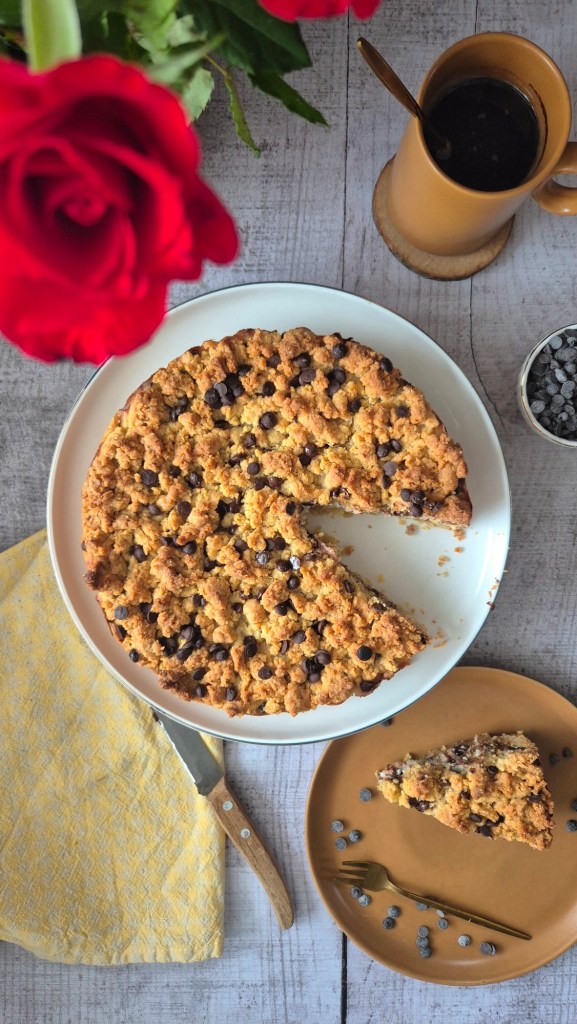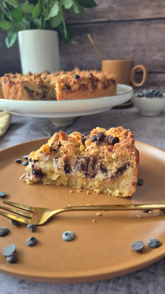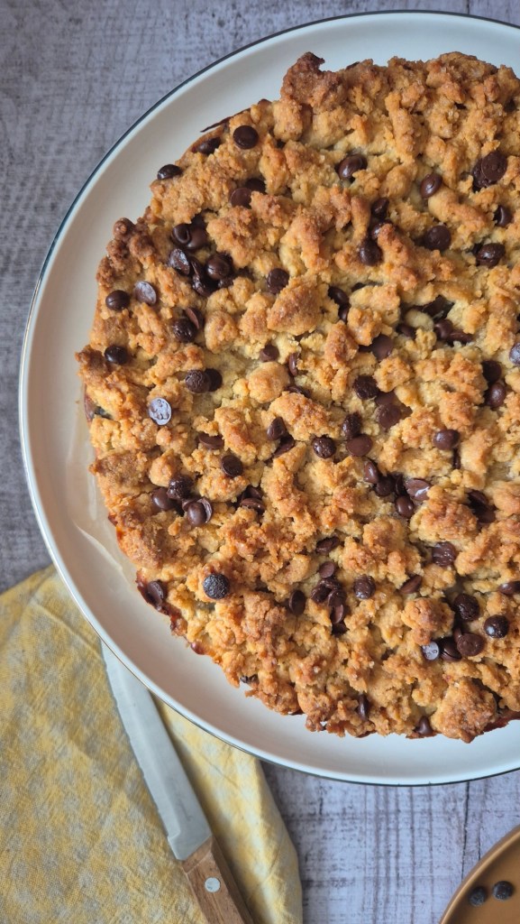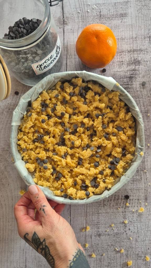 Distribuire sul fondo metà impasto creando una base, versiamo la crema di ricotta, livelliamo e copriamo con il restante impasto sbriciolato con le mani. Cospargere con un pò di gocce di cioccolato se gradite.